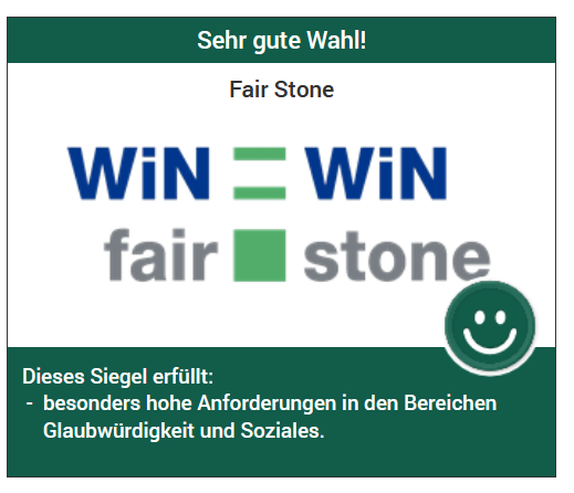 Due to improvements implemented in the last 2 years, the overall rating of the Fair Stone Standard has improved from “good choice” to “very good choice” with the new standard version. This change is due to the fact that Fair Stone has improved in the areas of credibility and social compatibility and has now reached the 70 point threshold in these two areas. Below you will find an overview of the points achieved in comparison: