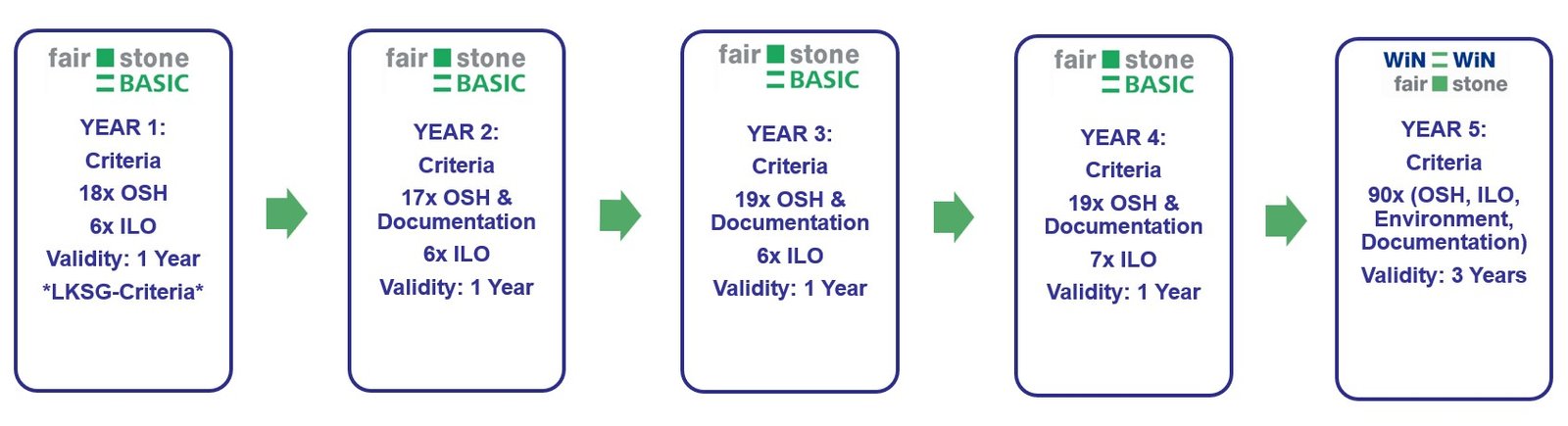 Fair Stone BASIC is intended as an introduction to the WiN = WiN Fair Stone certification. Annual audits with incremental requirements prepare the suppliers for the Full Scope Audit/FSA. It allows Fair Stone partners to conduct an immediate third -party audit at the same time as registering their supply chain. The audits are valid for only one year.