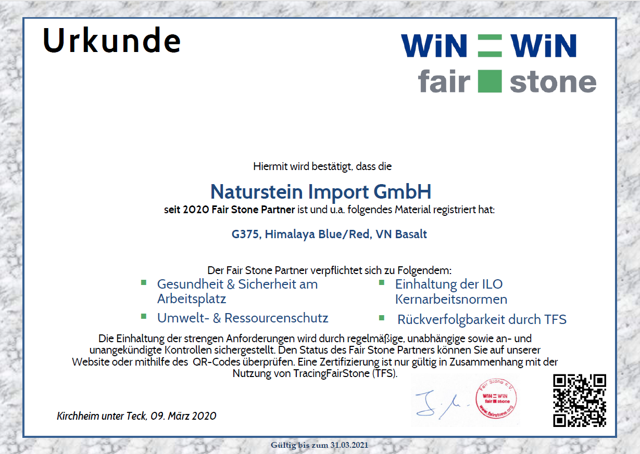 Unfortunately, the Fair Stone logo is sometimes misused. Only European natural stone traders who are Fair Stone partners can use the logo to participate in tenders that require an independent seal. It may also happen that Fair Stone partners offer products that do not come from registered quarries and factories, or for which the Fair Stone logo is not yet permitted because the prerequisites are not met. Please pay attention to the Fair Stone Partner Information on our website and use the QR-Code placed on certificates to check in realtime. Please report any suspected cases to us so we can rule out possible misuse.